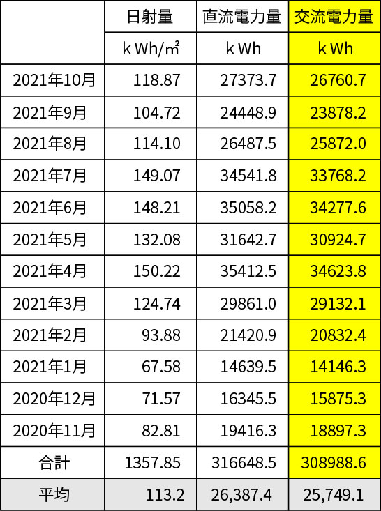 弊社ではCO2排出量削減は太陽光発電で発電した分、1kWあたり約650g減らすことができます。過去1年の年間発電量308,988kWhx650g=200,842kgとなり、年間約200トンのCO2を削減したことになります。これは、1世帯平均CO2排出量5,060kgで換算すると39世帯分に相当します。また、杉の木1本当たりの年間CO2吸収量は平均14kgなので、約1万4千本分の年間CO2吸収量に相当する事になります。