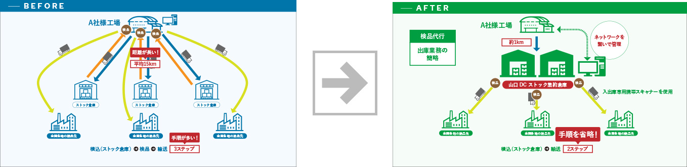 飲料メーカーA社様のストック倉庫は、工場から平均20㎞(最長80㎞)付近に分散しており、輸送の分散と輸送距離が課題でした。A社様から1㎞近辺にストック倉庫を新設し集約することで、輸送が一つに集結されるとともに輸送距離も大幅に削減されました。このため、大型トラック輸送のCO2を165トン削減することを達成しています。