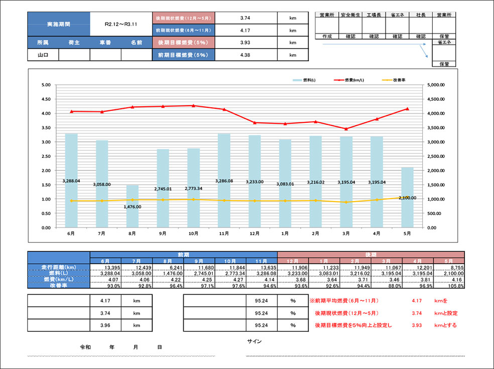 弊社では、2013年より燃費指導に取り組んでおり、CO2削減に寄与しています。毎月、車両ごとに燃費を計測し、運行管理者が各乗務員の皆さんに燃費改善の指導を行っています。