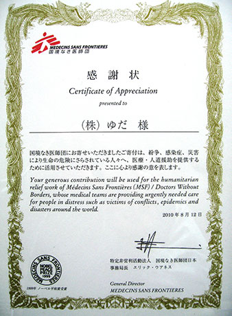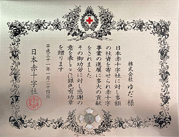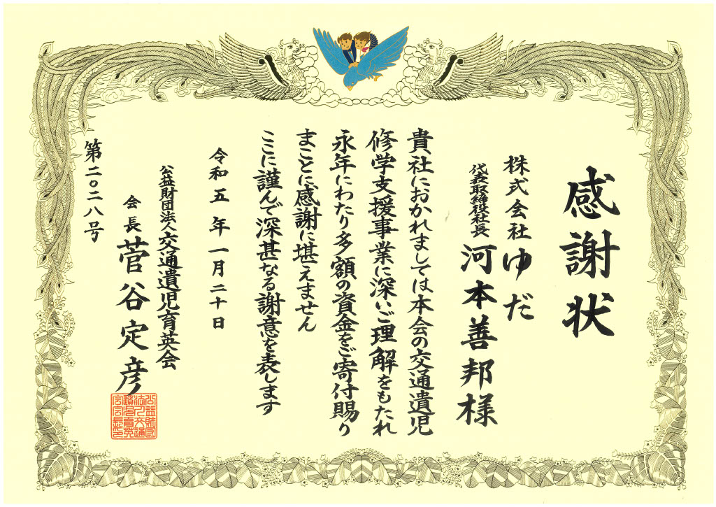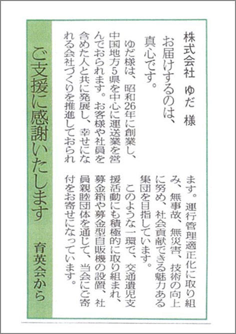募金型自動販売機を、2015年6月より各営業所に6台設置しており 飲料1本につき10円の募金を、交通遺児育英会に寄付を行っております。 また、弊社の社員親睦団体であります「ゆだ共済会」からも、2018年1月より寄付を行っており、 毎年55万円程度の寄付を実施しております。(2021年12月末現在、累計215万円寄付しております。) 交通遺児への寄付は、公共の道路を通行している私たちにとっては、加害・被害の両方の側面から 当事者になり得る可能性を常に持っています。 自動販売機を設置する事で、安全運転・事故防止や社会貢献活動に目を向ける啓蒙活動にもつながります。