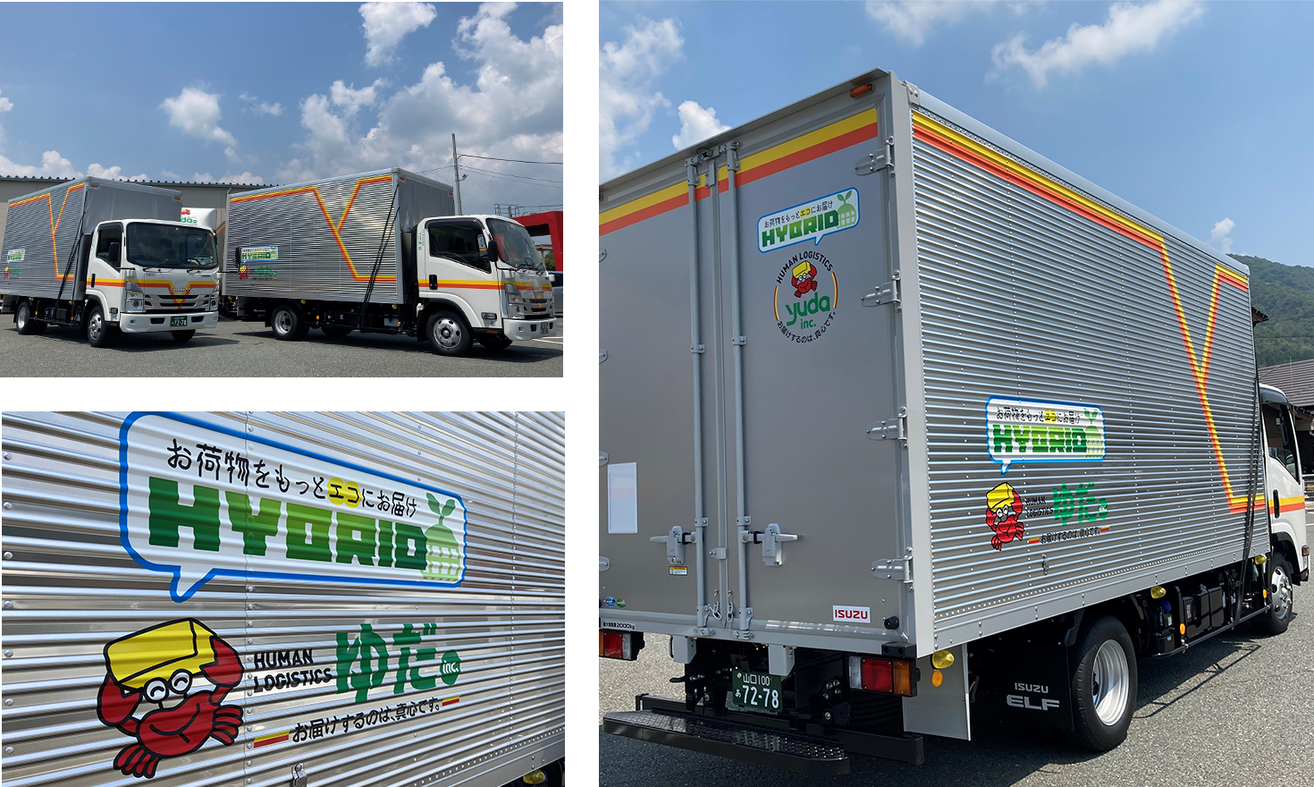 トラックの大きな課題であるCO₂排出を削減すべく、山口県で初めてHVトラックを導入しました。既存トラックとの検証も進め、低CO₂化と燃費の向上を行います。現在は2tトラック2台ですが、今後もHVトラックの導入を進めCO₂を削減します。脱炭素社会の実現に貢献し、環境にやさしい会社を目指します。