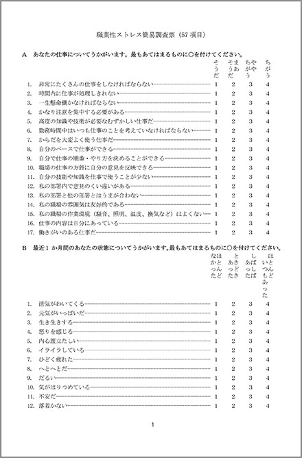 そこで、2015年12月から労働者数50人以上の事業所を対象とし、毎年1回全ての労働者に対して、心理的な負担の程度を把握するための検査「ストレスチェック」及びその結果に基づく面接指導の実施等を内容とした「ストレスチェック制度」を実施することが法律で義務付けられており、弊社でもストレスチェックを年1回実施し、精神面を含めた健康状態を把握し、社員の心理的な病の未然防止に努めています。