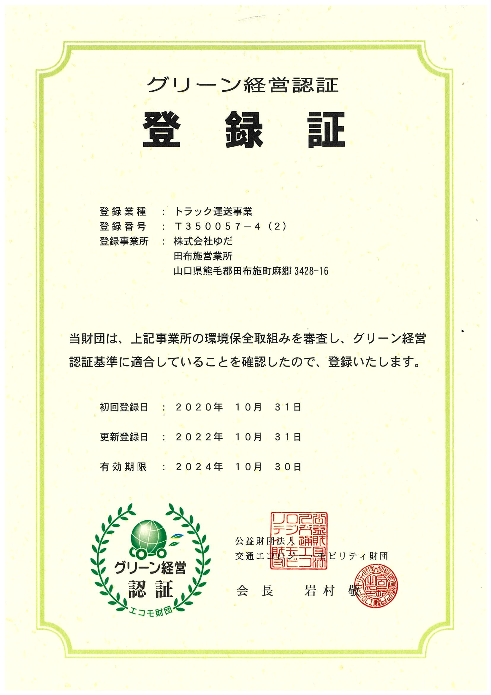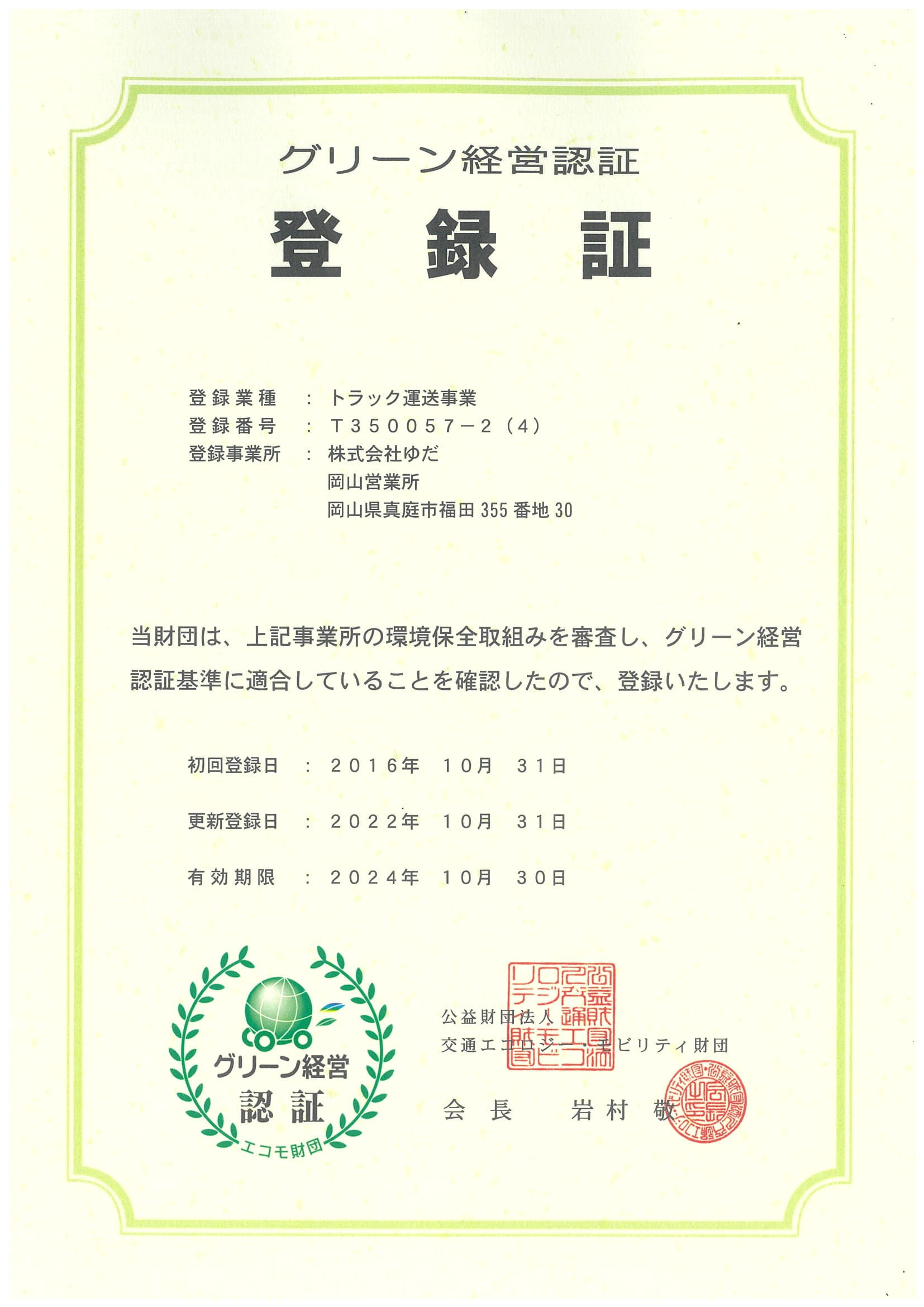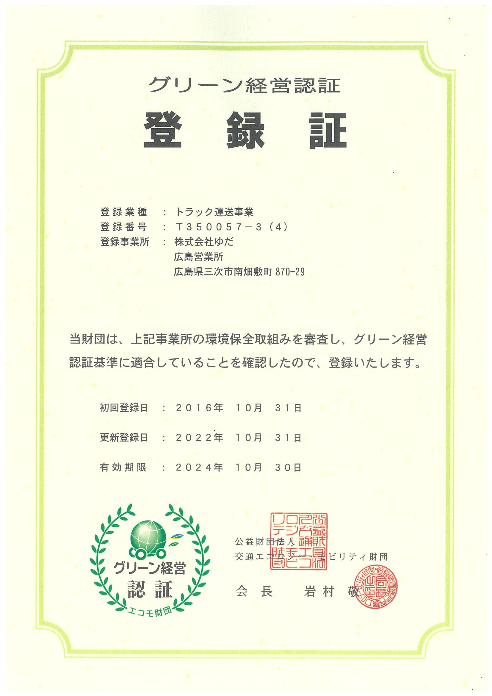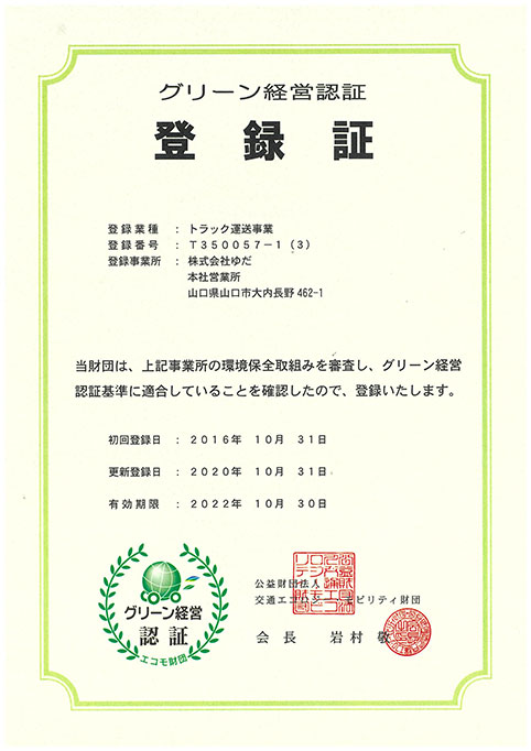 2016年10月にグリーン経営認証を取得し、積極的に環境に配慮した活動を推進しています。輸送に係るCO2の排出による環境への影響は計り知れません。弊社は環境への負荷の少ない事業運営体制を構築して、持続可能な社会の実現に貢献し続けます。