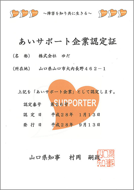 あいサポート企業に2016年1月に認定されました。弊社では、障害のある方に対して愛情を持ってふれあい、助け合いながら一緒に働く上で、ちょっとした手助けや配慮を実践する「あいサポータ」の活動に取り組んでいます。