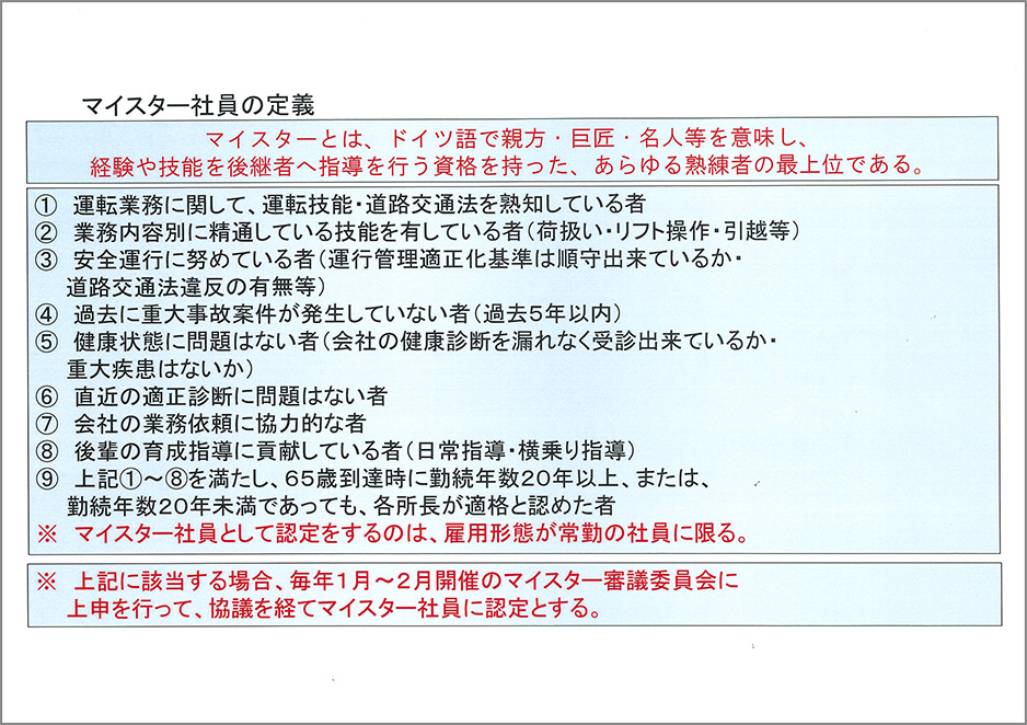 定年後に嘱託社員として勤務していただいている社員の方の中でも、特に会社でのキャリアも長く経験と技能を積み、後輩や後継者の指導・育成等に努めていただいている社員の方々を、あらゆる熟練者の最上位の意味を込め、弊社では「マイスター社員」と認定しています。
