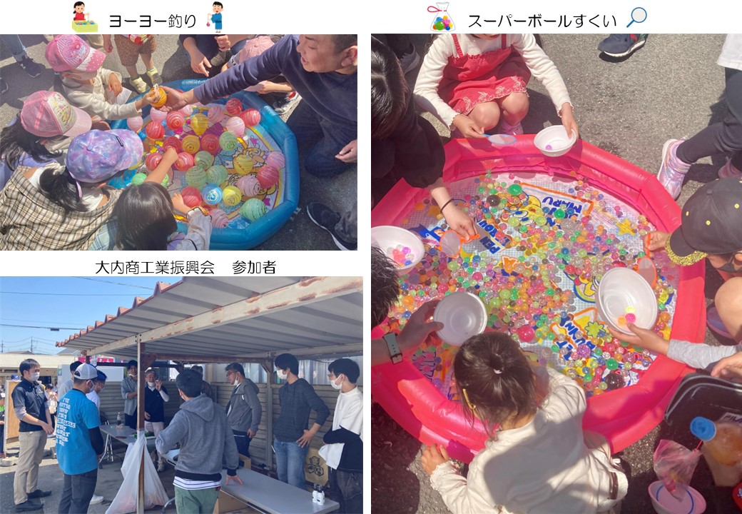 おまつり開始から沢山の子ども達がブースに遊びに来てくれ、おまつり終了時間よりも早くに商品が売り切れてしまい、子ども達に喜んでもらえる様次回はもっと数を増やして出店しようと大内商工業振興会参加メンバーで話をしております。