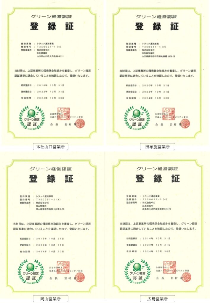 本社(山口)営業所、岡山営業所、広島営業所において、3回目のグリーン経営認証基準に適合して認証されました。