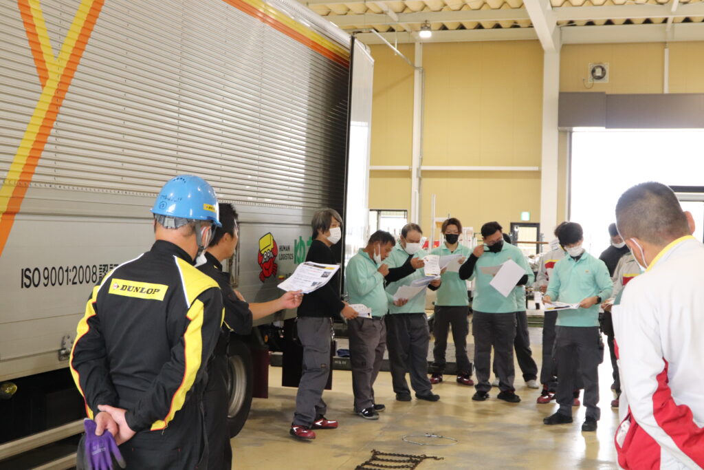 いすゞ自動車講師の方からは日常点検の重要性と雪道走行の心得について、ダンロップ講師の方からはタイヤチェーン取付実技講習を行って頂きました。