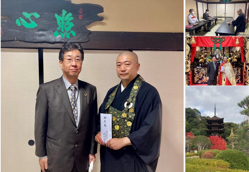 住職様とお話をさせて頂いた後に、本堂にて訪問者3名が社を代表して社運隆昌祈願をして頂きました。(左から 河本社長 / 渡邉住職)