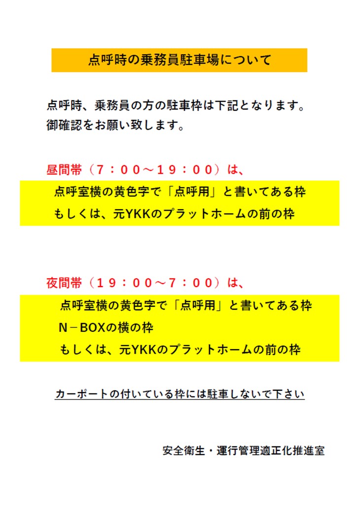 安全衛生・運行管理適正化推進室より、点呼時の乗務員駐車場についてお知らせです。皆さまご確認をお願い致します。