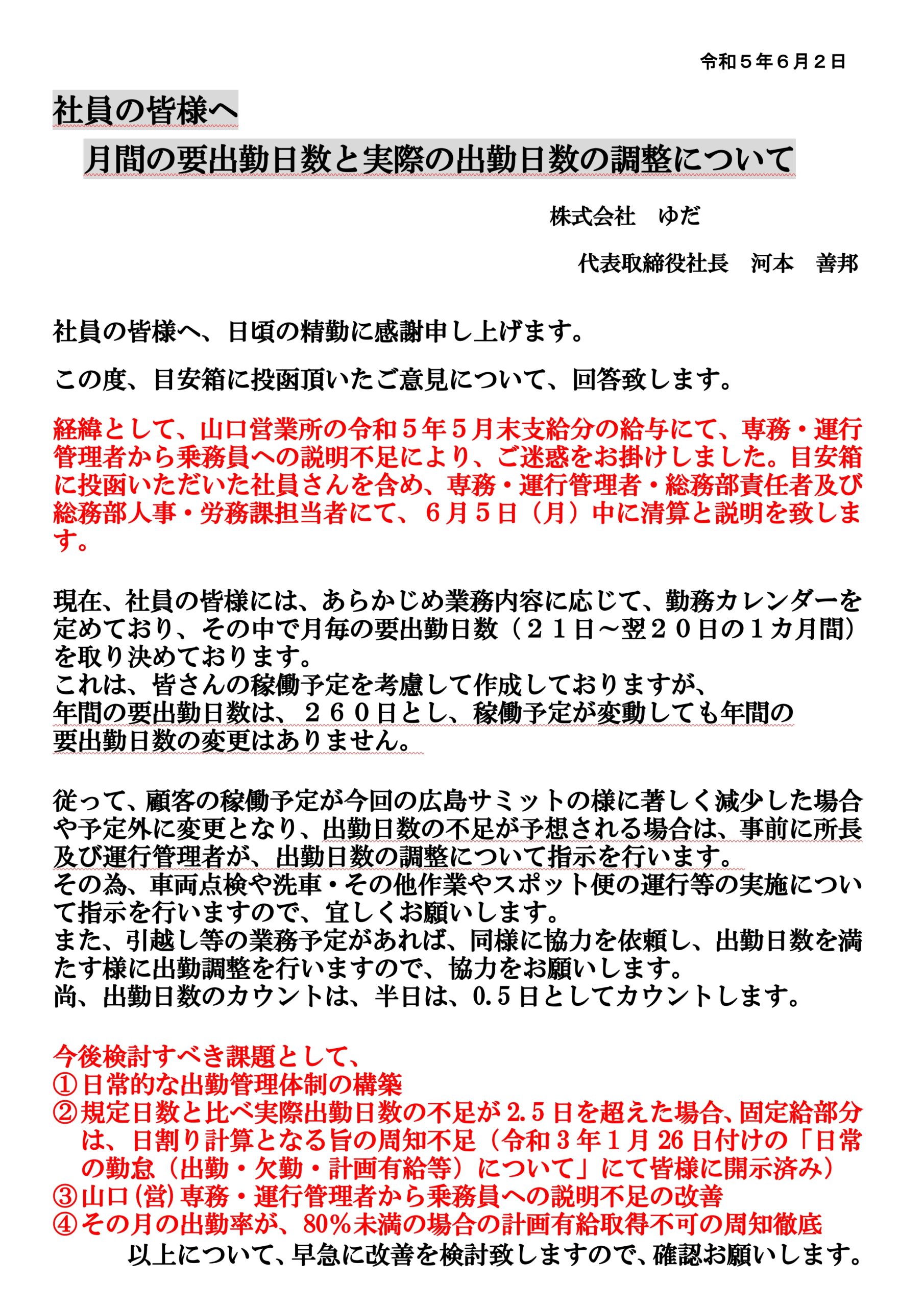 社員の皆様へ 「出勤日数の調整」についてのお知らせ